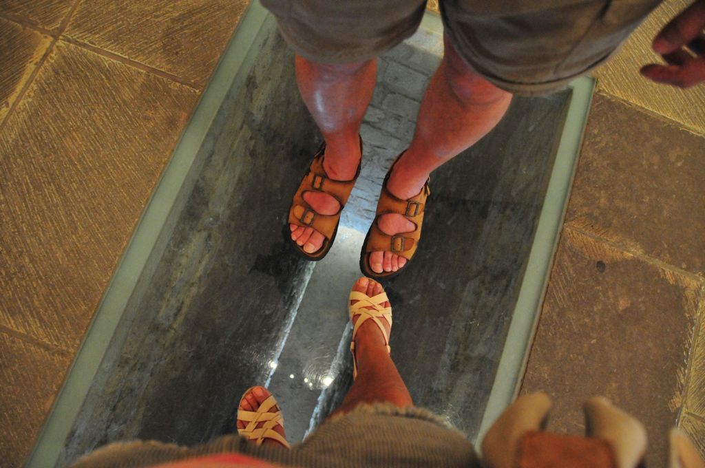 Two pant legs, a disk of peanuts and a bag of cookies, two bottles of water, the little camera and one iPhone, two guide books and the travel journal, the tiles we bought, lip-gloss, a bottle of hand sanitizer, and gum!/